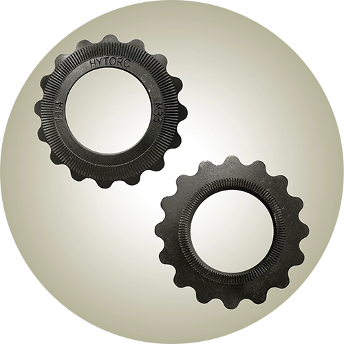 Fasteners HomeFasteners WASHERS HYTORC WasherEliminates the need for a separate reaction fixture. Safer and more efficient (no pinch points). ASTM compliant. Backup WasherEliminates the need for a backup wrench. Safer and more efficient (no pinch points). Complies with ASTM F3394/F3394M Standard. J-WasherInnovative locking mechanism keeps bolts tight under dynamic loads. Ridged bands prevent rotation and protect the flange surface. NUTS HYTORC NutConverts torque into tension, eliminating galling and the need for a separate reaction fixture. GRIP-TIGHT™ NutSpecialized lug nut designed for commercial vehicles that increases torque-to-load accuracy. Gall-Free NutEliminates galling (metal transfer) in unlubricated fasteners, ensuring smoother applications.